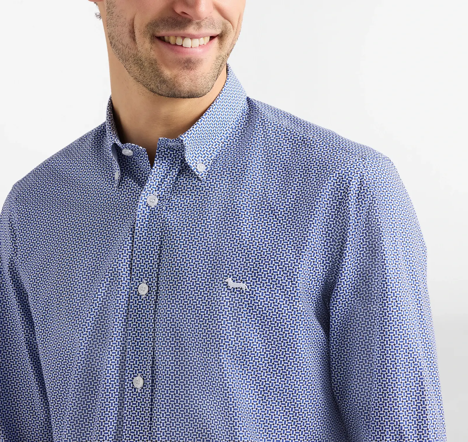 Completa il design l’iconico bassotto ricamato sul petto, simbolo distintivo del brand, che aggiunge un elemento riconoscibile e di qualità. Facile da abbinare con pantaloni eleganti, chino o jeans, questa camicia rappresenta un must-have nel guardaroba maschile contemporaneo.