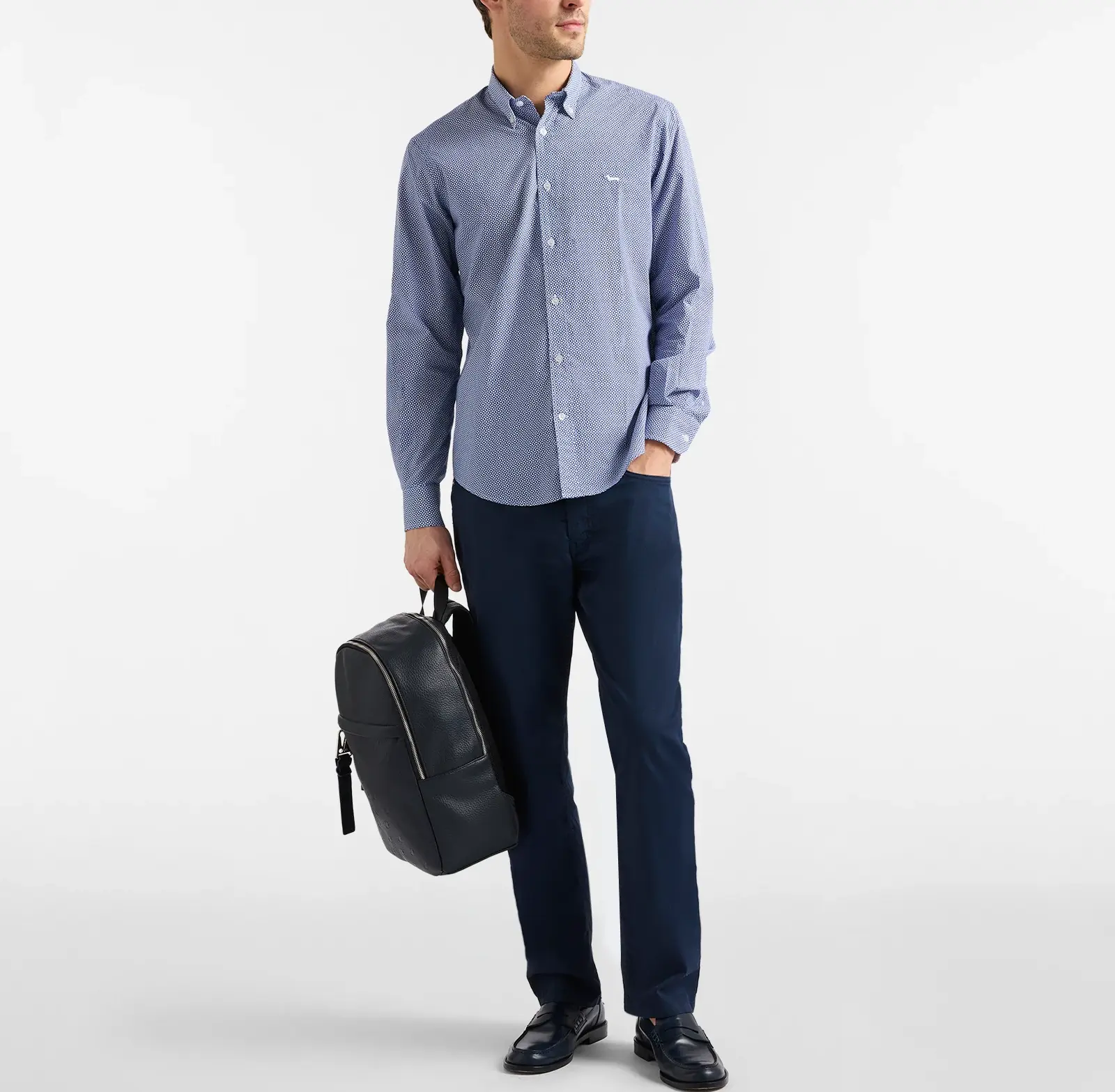 Questa camicia da uomo Harmont & Blaine in blu navy è realizzata in puro cotone, un tessuto naturale che garantisce comfort, traspirabilità e una vestibilità piacevole per tutto il giorno. Il design è caratterizzato da una raffinata micro stampa all over che dona profondità al colore e aggiunge un tocco di originalità discreta, ideale per chi cerca uno stile elegante ma non banale.
