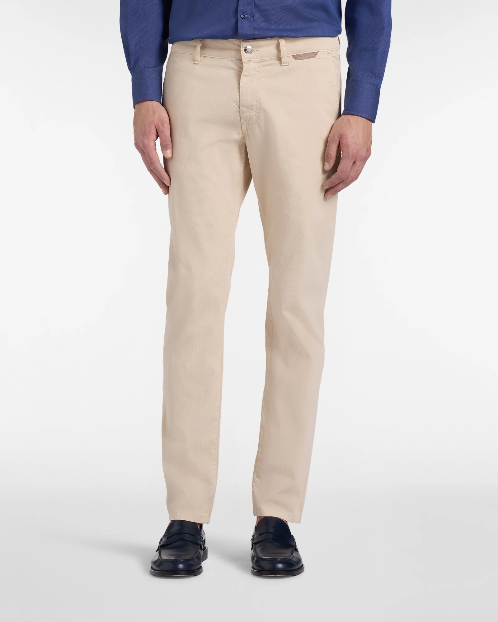Il modello presenta una costruzione a cinque tasche rivisitata in chiave elegante, con chiusura frontale con zip e bottone e passanti per cintura che ne aumentano la versatilità.