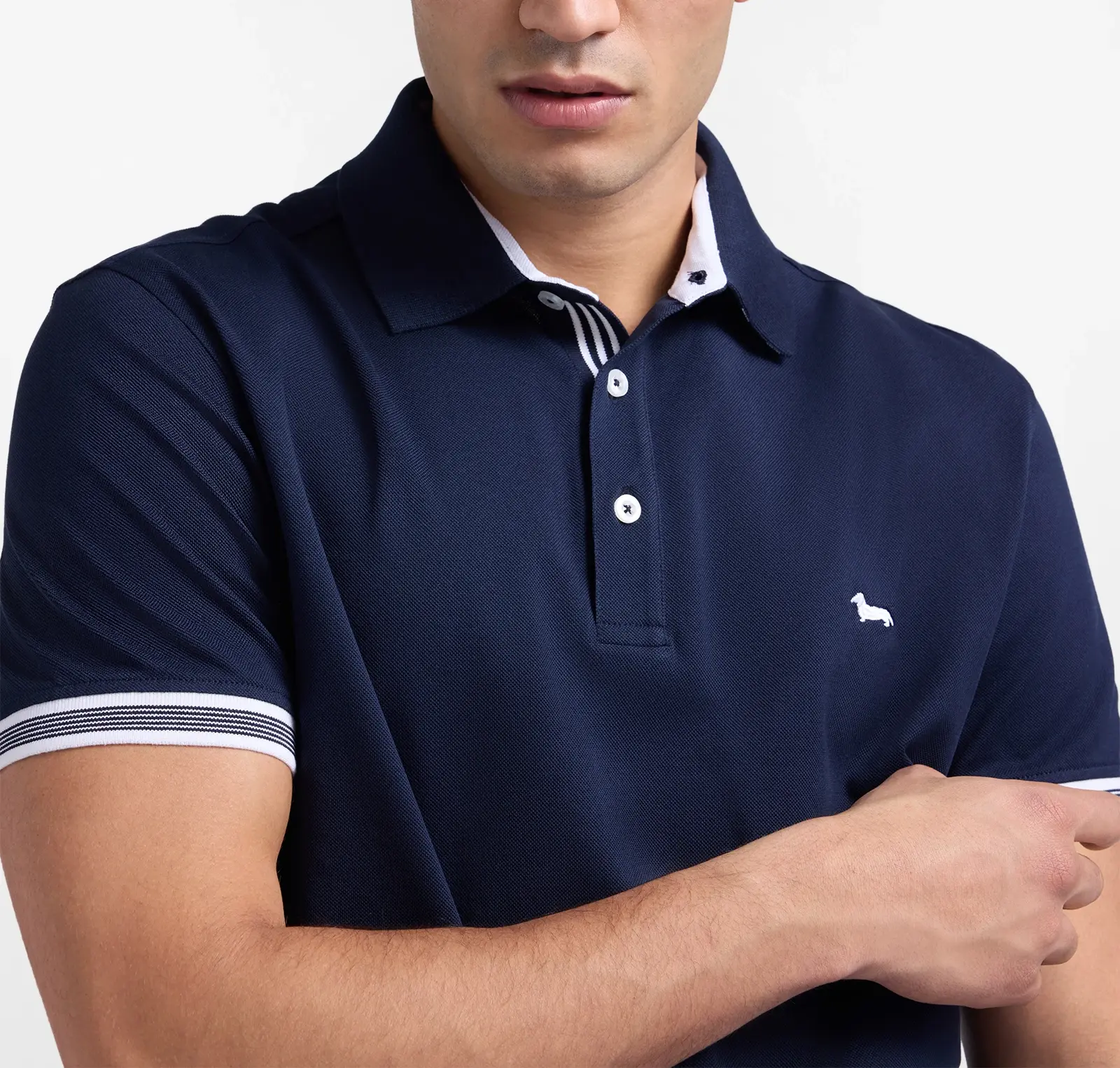 Polo uomo in piquet di cotone con orli rigati a contrasto e vestibilità confortevole, ideale per un look casual elegante firmato Harmont & Blaine.